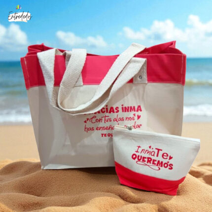 Original bolsa, fabricada en resistente poliéster de acabado natural. Compartimento principal y neceser interior con cierre de cremallera. La bolsa perfecta para ir a la playa? un bolso molón para una profe que ha trabajado mucho y por su paciencia y dedicación se lo merecen.