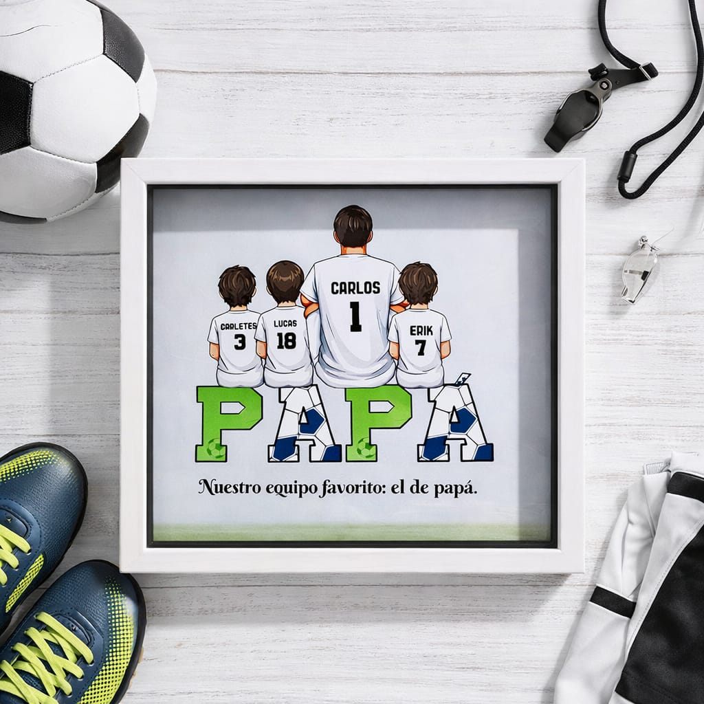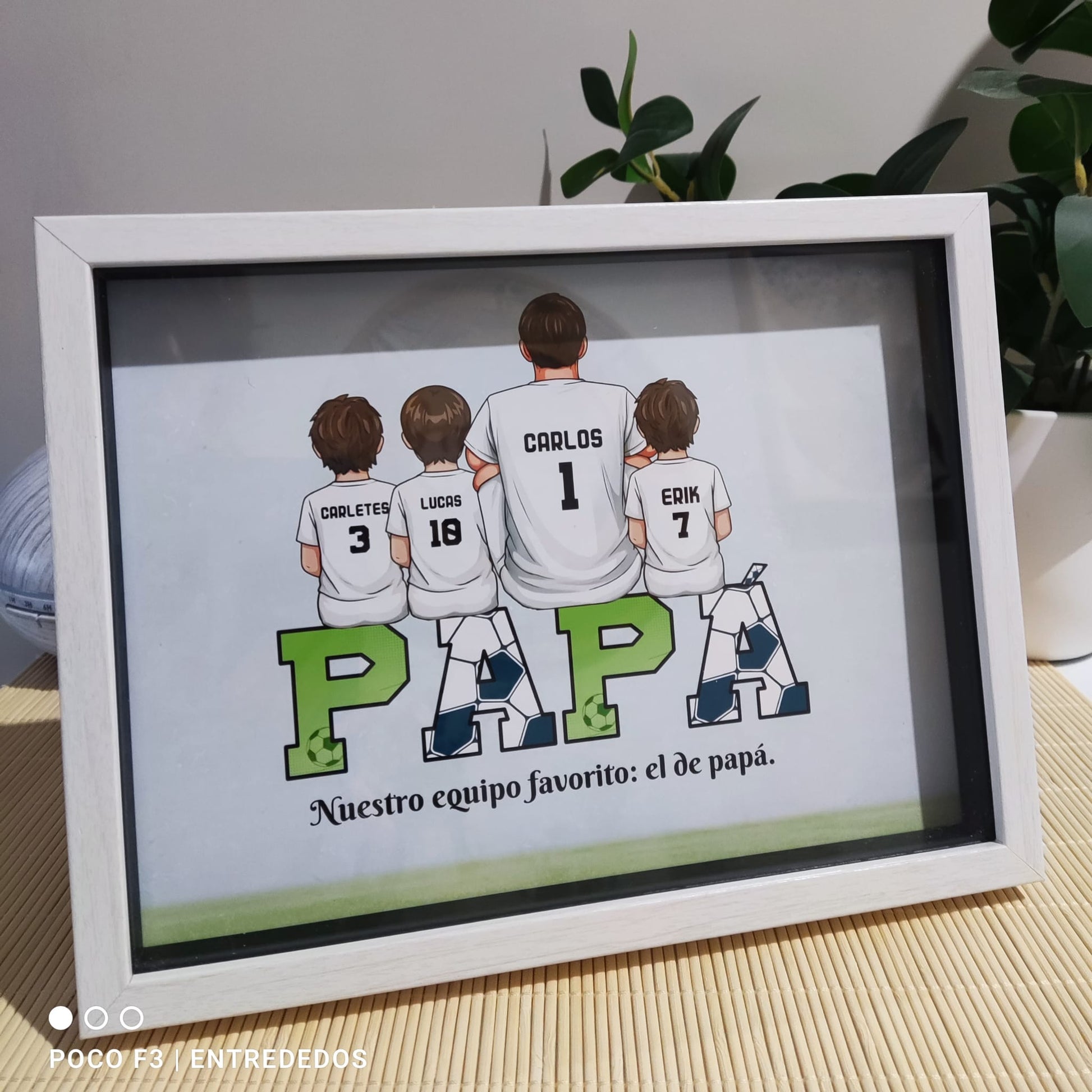 Cuadro de 18 x 24 cm con diseño de silueta de papá y de los niños, inspirado en un equipo de fútbol. Es un regalo original y especial para familias amantes del fútbol. ⚽