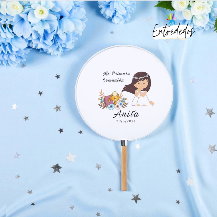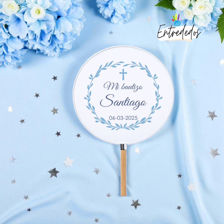 Un detalle elegante y original para bodas, comuniones, bautizos u otros eventos especiales. Fabricado en resistente poliéster especial para sublimación, con mango de bambú y un toque cromado que lo hace aún más sofisticado.