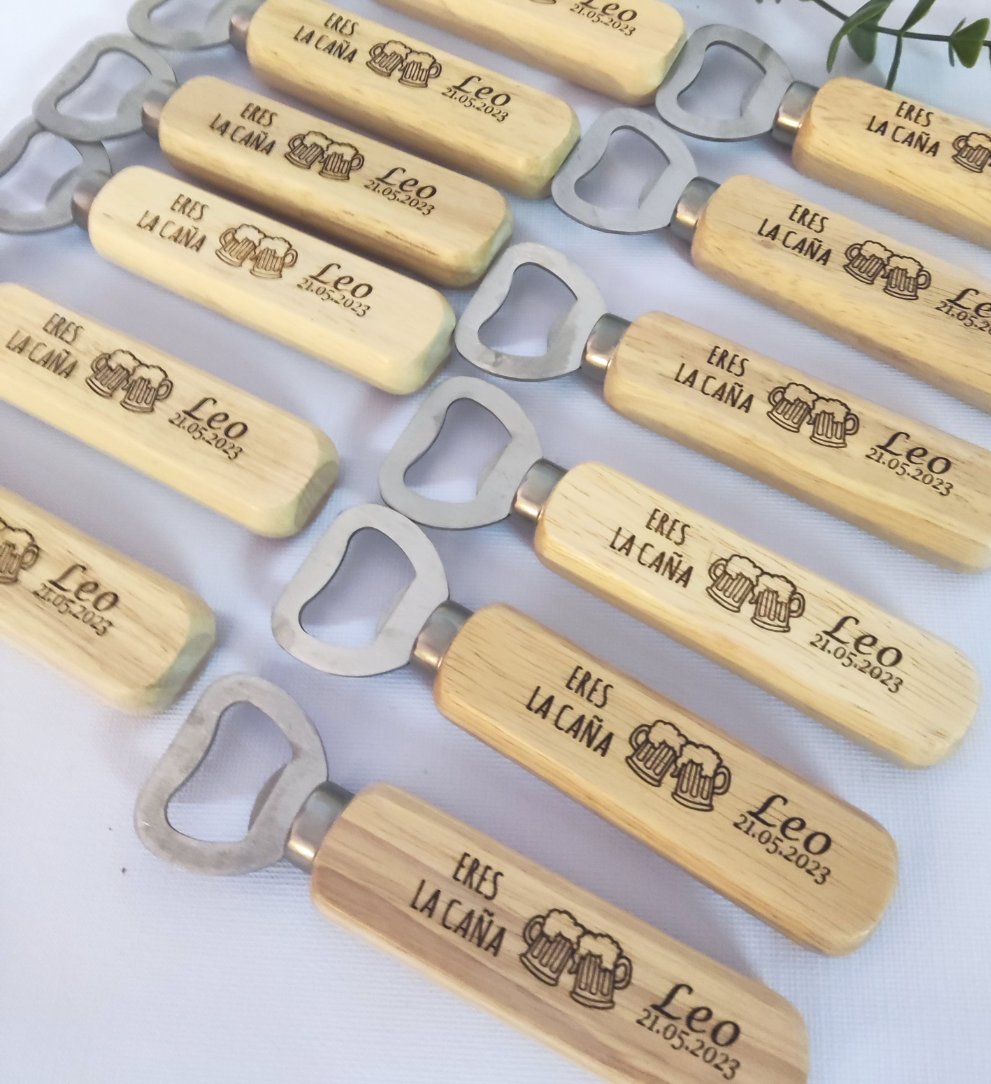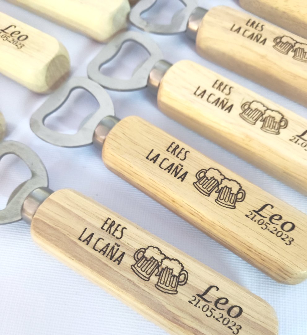 Sorprende a tus invitados con un detalle bonito, práctico y con un toque especial. Este abridor está fabricado en madera de haya natural con cuerpo de acero inoxidable, y se personaliza mediante grabado láser de alta calidad. Un recuerdo útil y original que encantará en comuniones, bodas o bautizos.