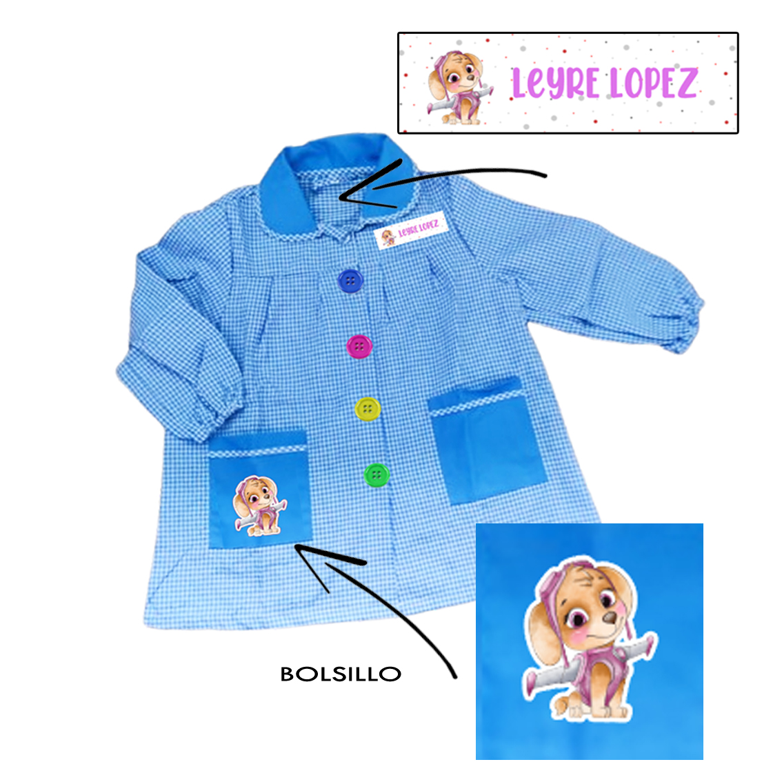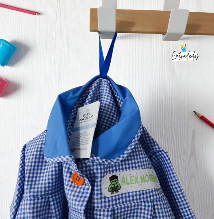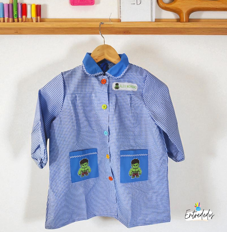 Personalización única: Elige el personaje favorito de tu niño (superhéroe, animalito o personaje animado) y lo añadimos junto a su nombre en el bolsillo.