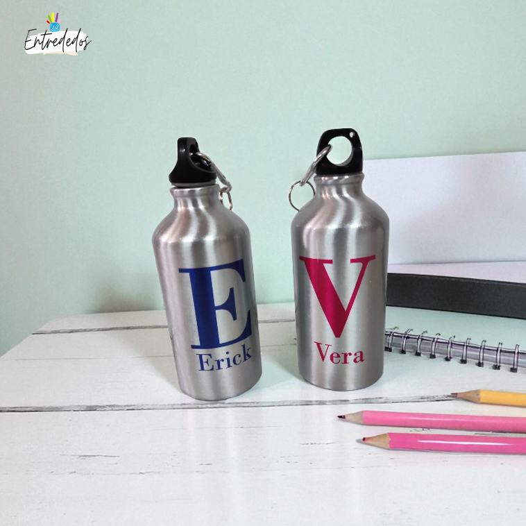 ¡Aprovecha esta oportunidad única! Bidón de aluminio color plata personalizable con inicial de colores para hacerlo totalmente tuyo.