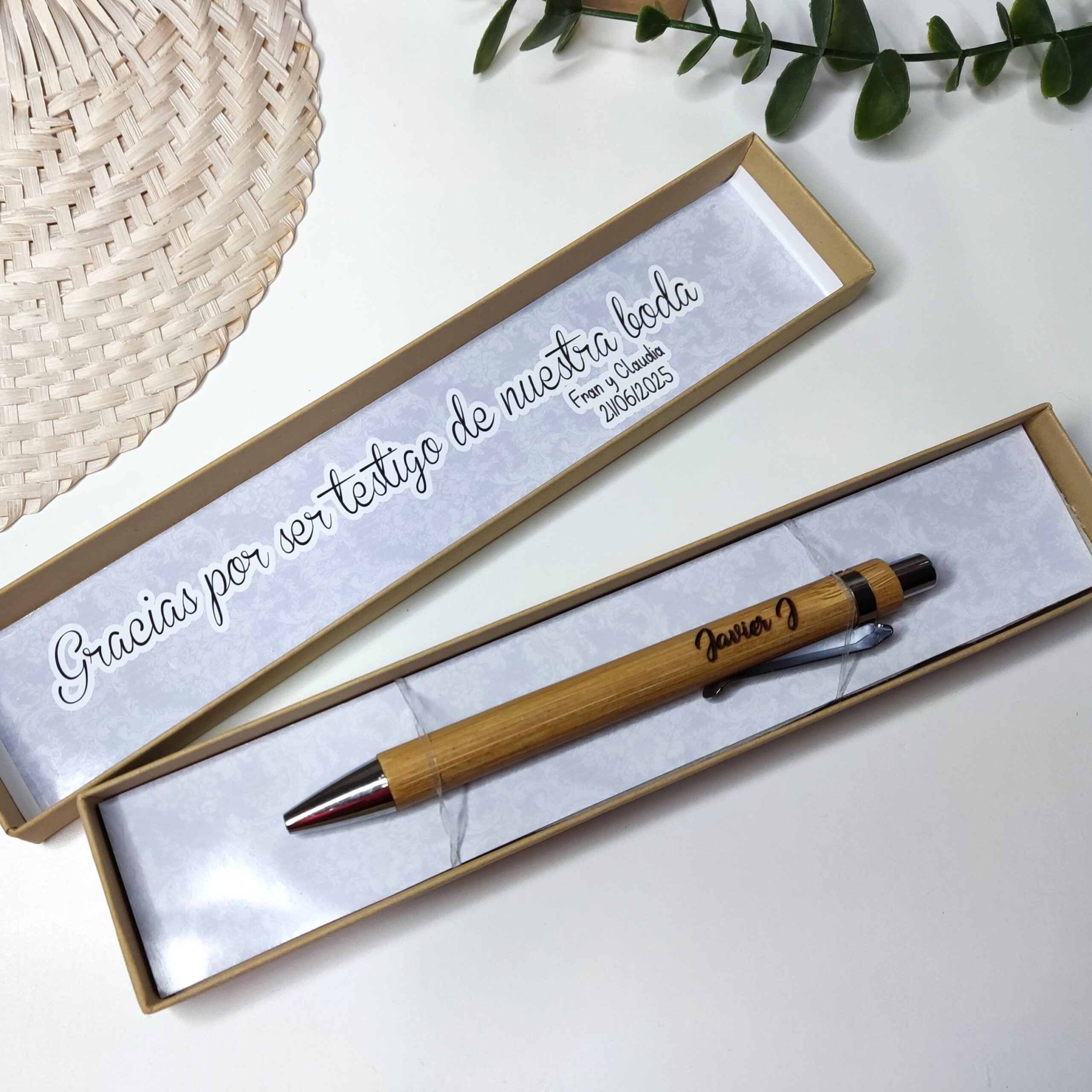 Una forma original, elegante y práctica de pedirle a esa persona especial que sea testigo en el día más importante de vuestras vidas. Este bolígrafo grabado a láser, presentado en una cajita personalizada, será un detalle que sorprenderá y emocionará.