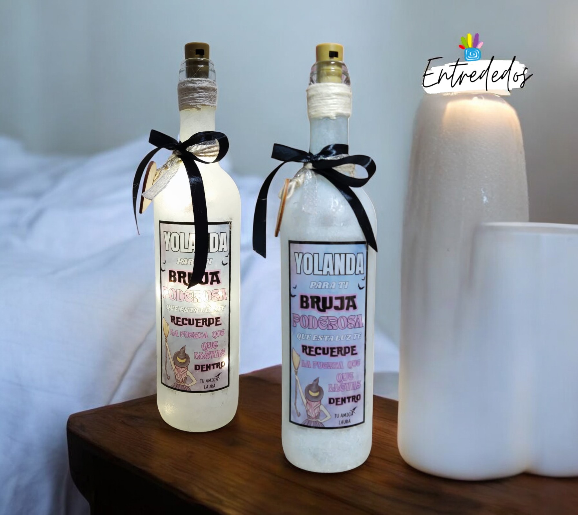 Nuestra botella luminosa decorativa es el regalo perfecto para expresar cariño de una forma original. Puedes personalizarla con el nombre de la persona que recibirá el regalo y el nombre de quien lo obsequia, convirtiéndola en un recuerdo único e inolvidable. 💖