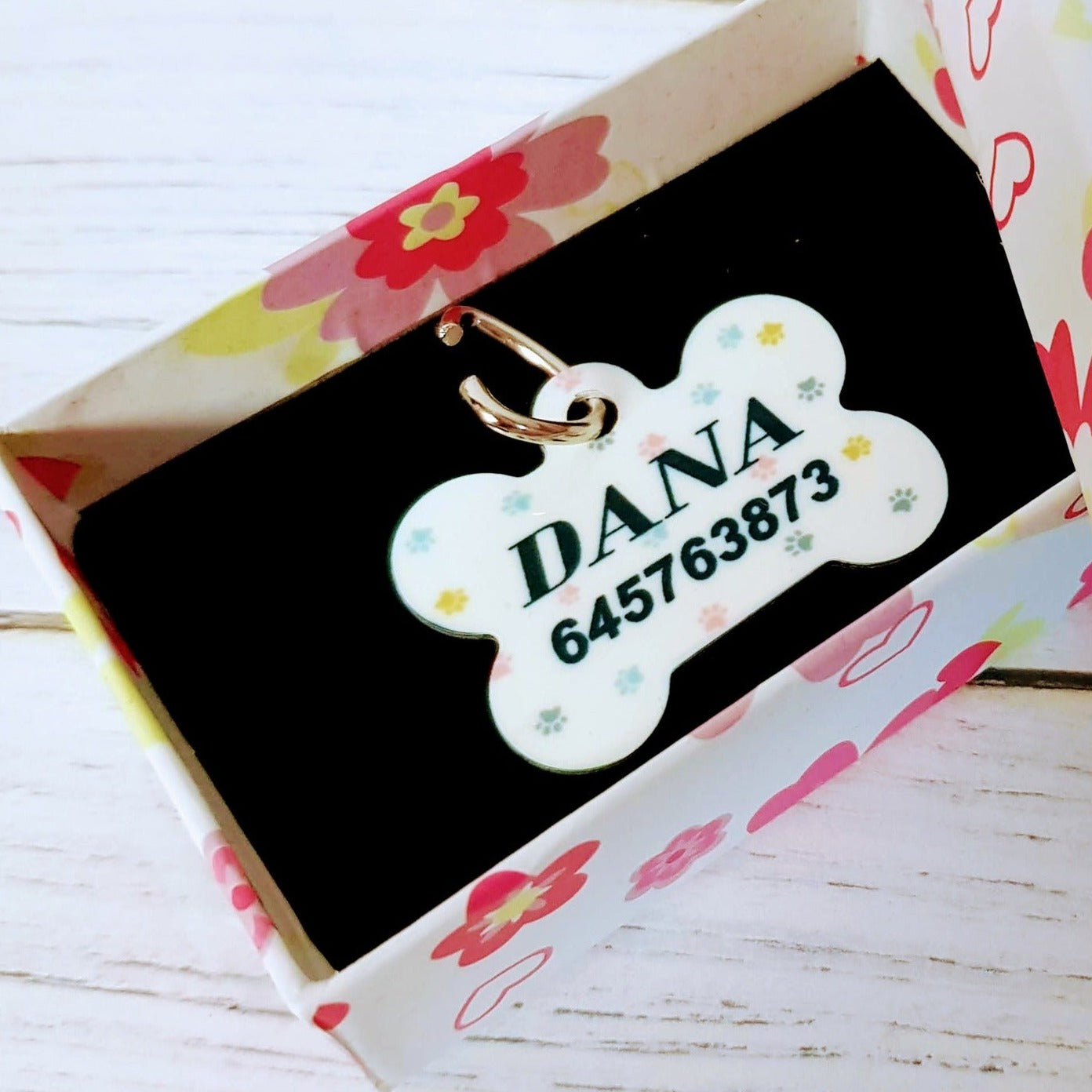 Identifica a tu perro con esta bonita chapa personalizada impresa a todo color, para no tener ningún problema en caso de que se pierda. Podrás poner su nombre y tu teléfono