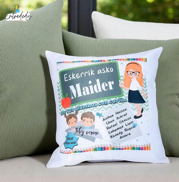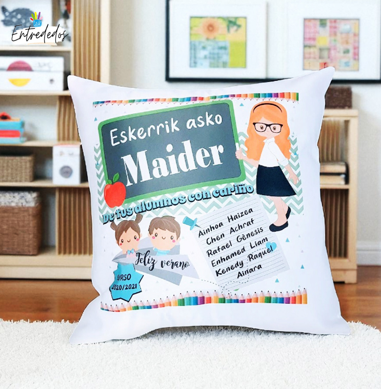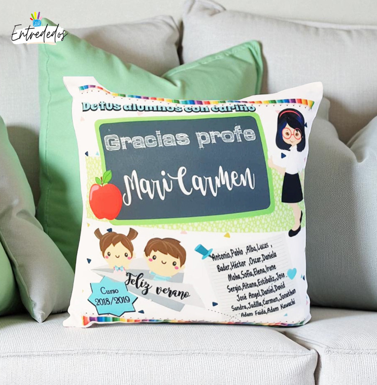 Cojín personalizado para el profesor con los nombres o los dibujos de sus alumnos. Un regalo original para maestros y profes en fin de curso. medida 40 x 40. puedes elegir el color del pelo de la profesora rubia o morena.