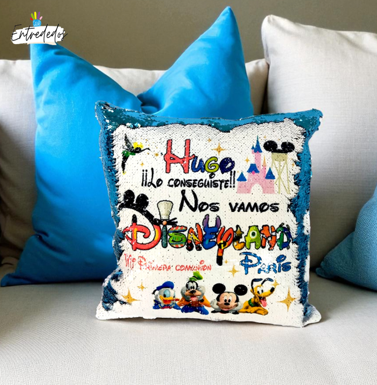 Cojín con lentejuelas disponible en color rosa con mensaje escondido de sorpresa a Disney.