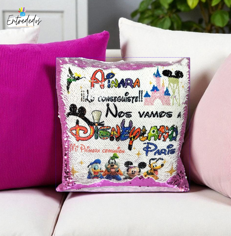 Cojín con lentejuelas disponible en color rosa con mensaje escondido de sorpresa a Disney.
