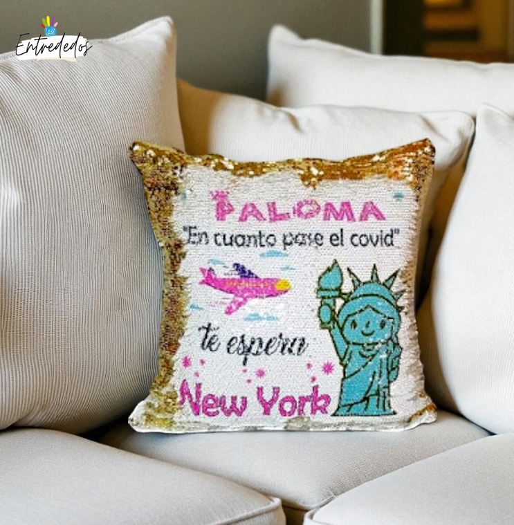 Cojín con lentejuelas disponible en color DORADO con mensaje escondido de sorpresa a New York