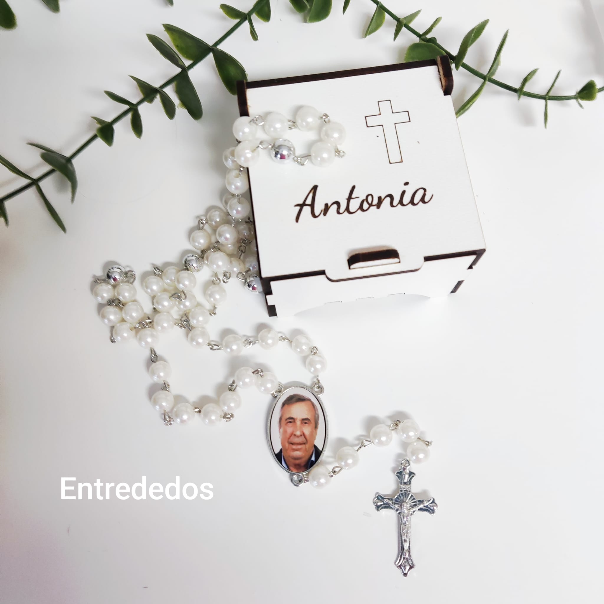 Un detalle lleno de fe y significado. Este rosario de metal con cuentas blancas incluye una placa personalizada con la foto de tu ser querido, la imagen de la Virgen que veneras o una dedicatoria especial.