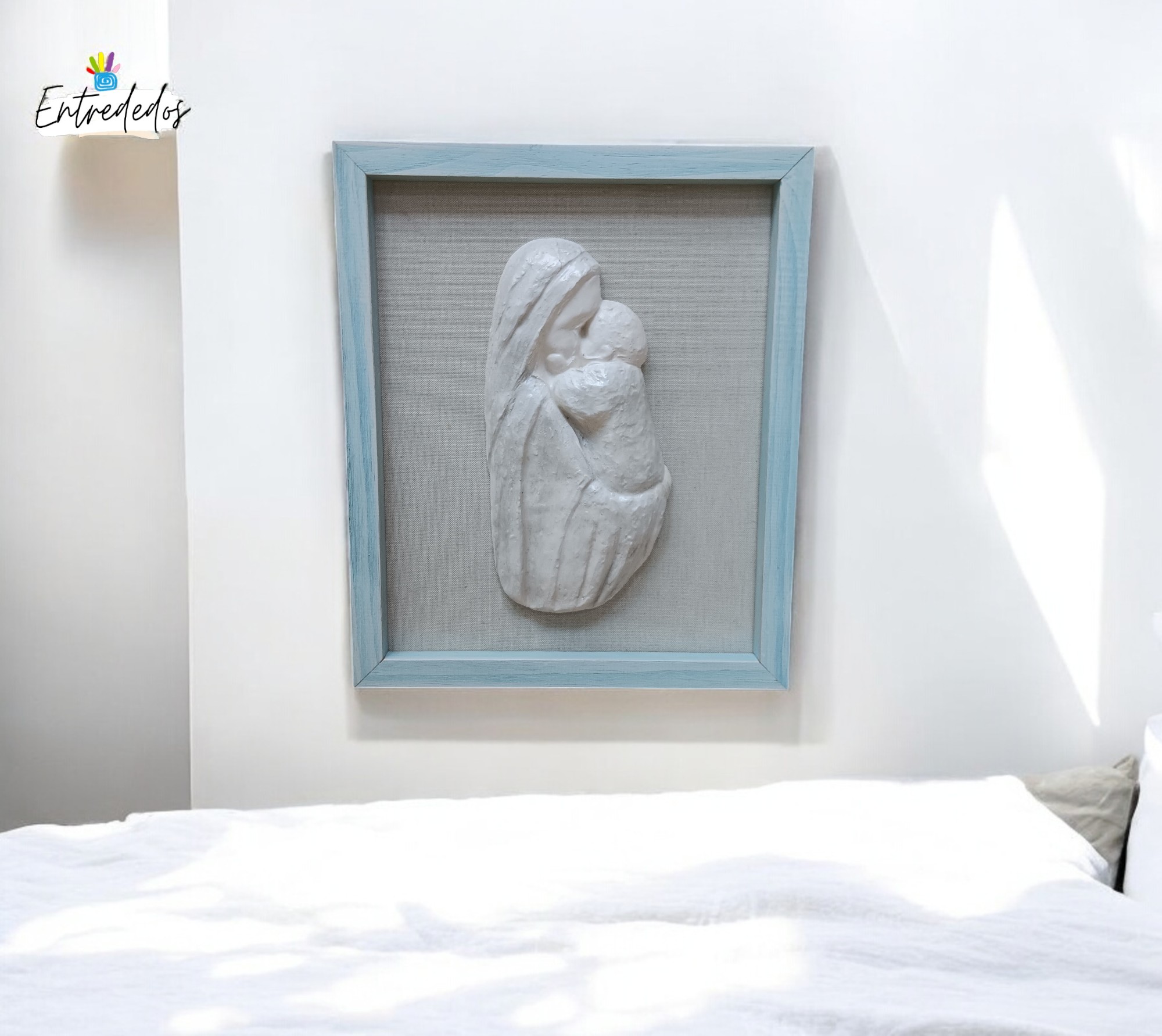 Este cuadro representa a la Virgen María en un tierno abrazo con el Niño Jesús, transmitiendo serenidad, amor y una profunda sensación de paz. Los colores naturales utilizados en la imagen aportan calidez y un estilo suave y armonioso.