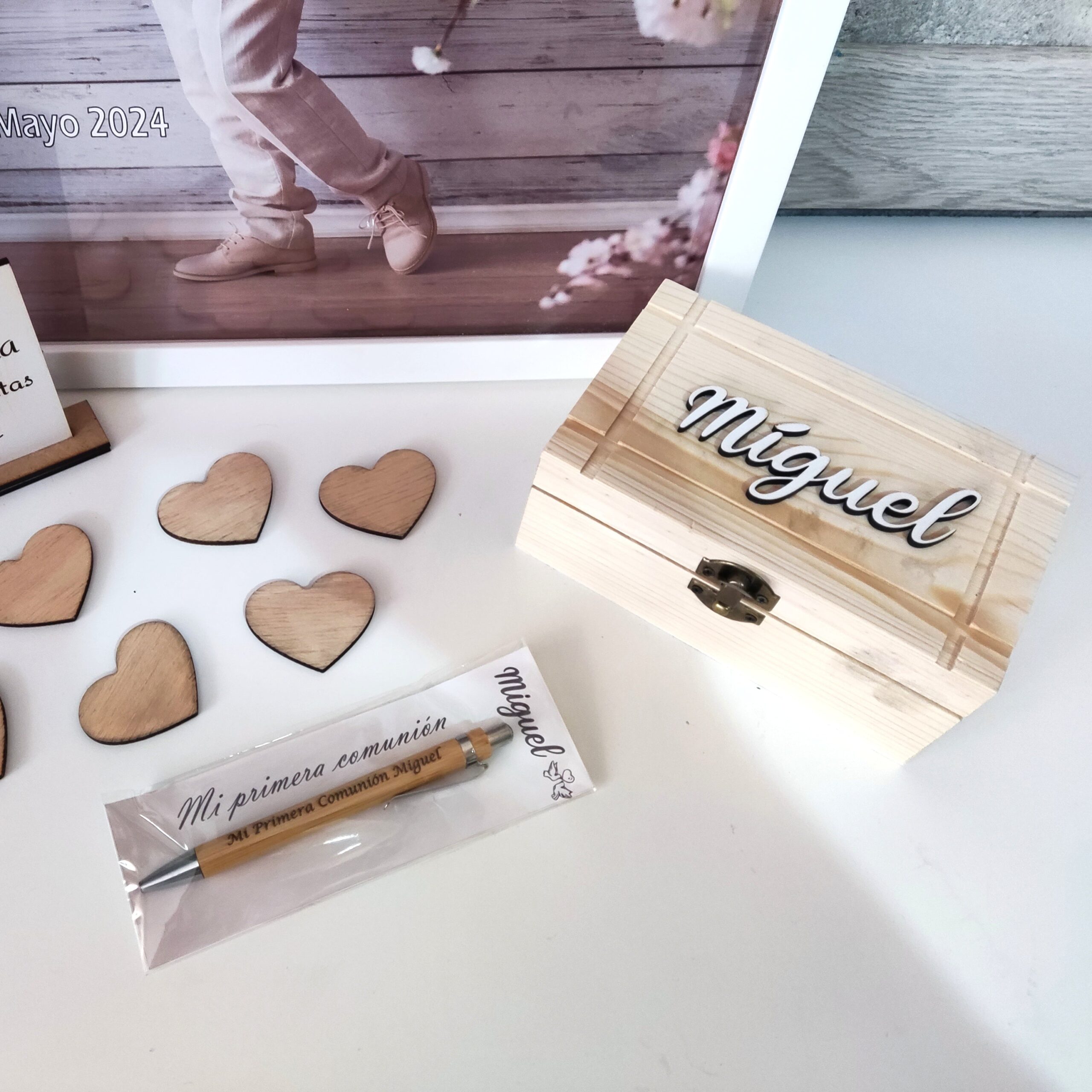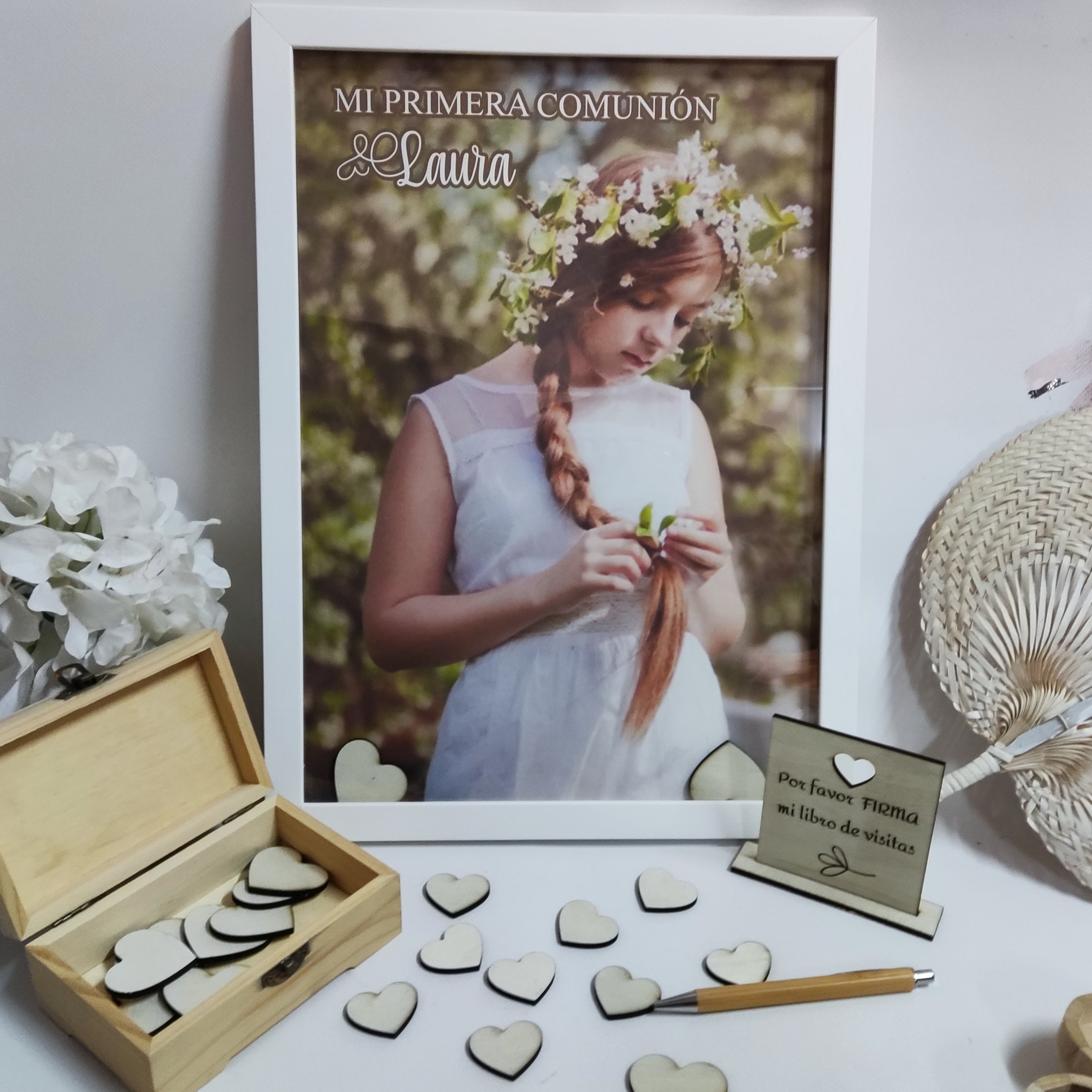 Sorprende a tus invitados con un cuadro para firmas de comunión o boda totalmente personalizado. Este cuadro es una alternativa original y encantadora al tradicional libro de firmas, agregando un toque personal y memorable a la celebración. Además, es un regalo perfecto para tu hijo o hija, ideal para decorar su habitación y recordar ese día tan especial.