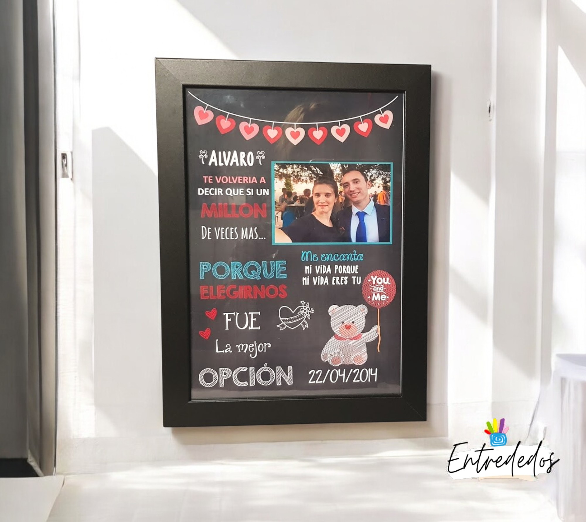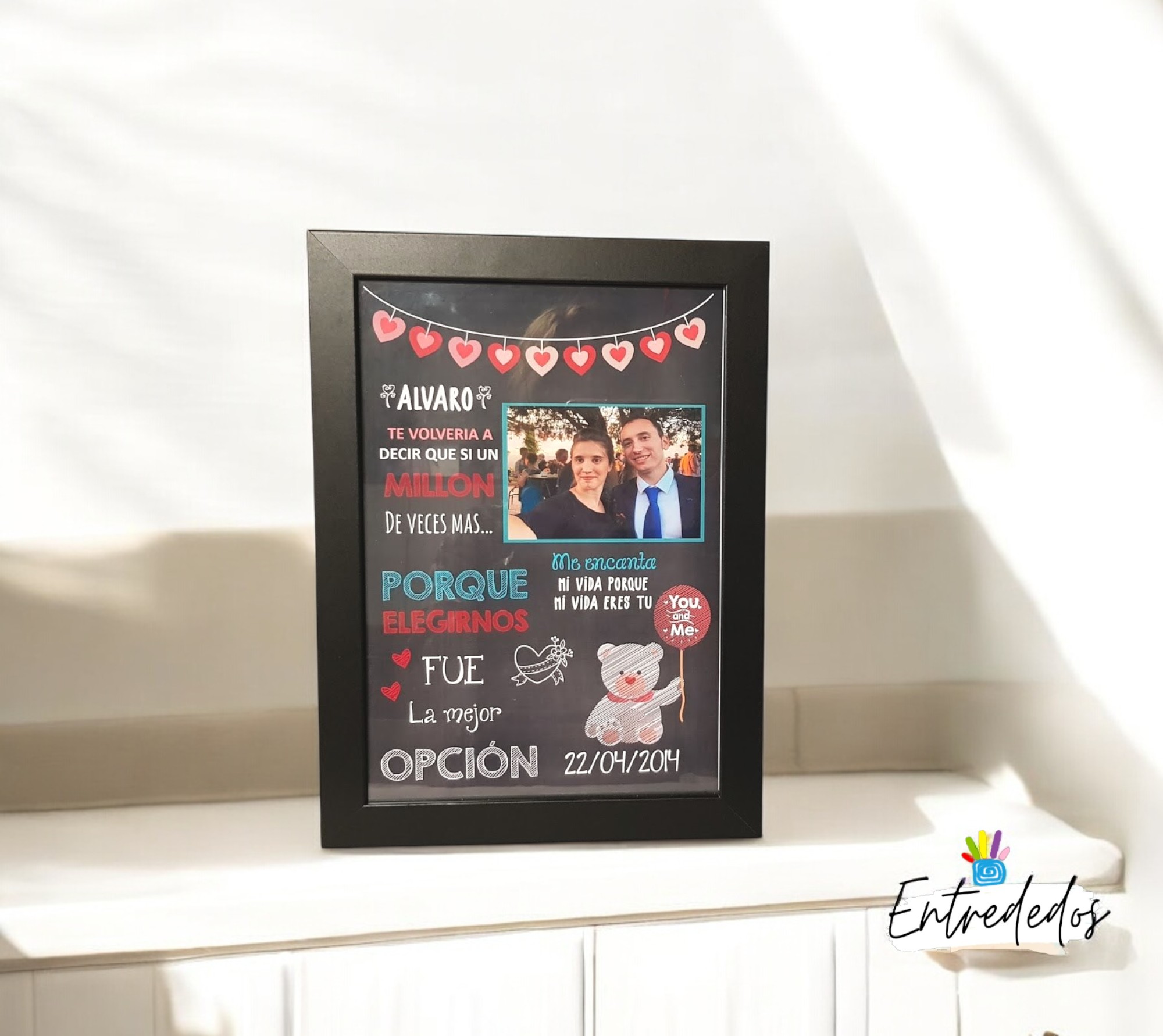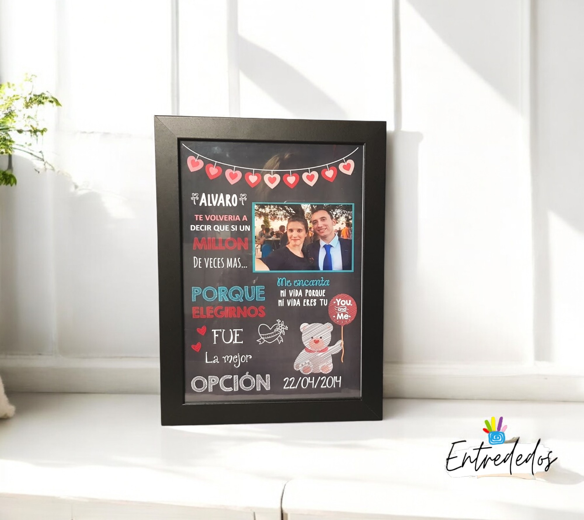 Incluye vuestra foto favorita y vuestros nombres, con la opción de elegir el color del marco en blanco o negro según la decoración de tu hogar.
