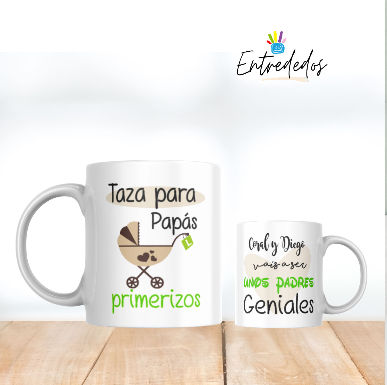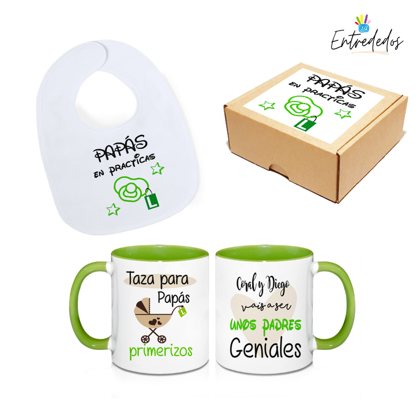 – Mensaje especial: Además de los nombres, incluye una frase significativa como “Taza para papas primerizos”