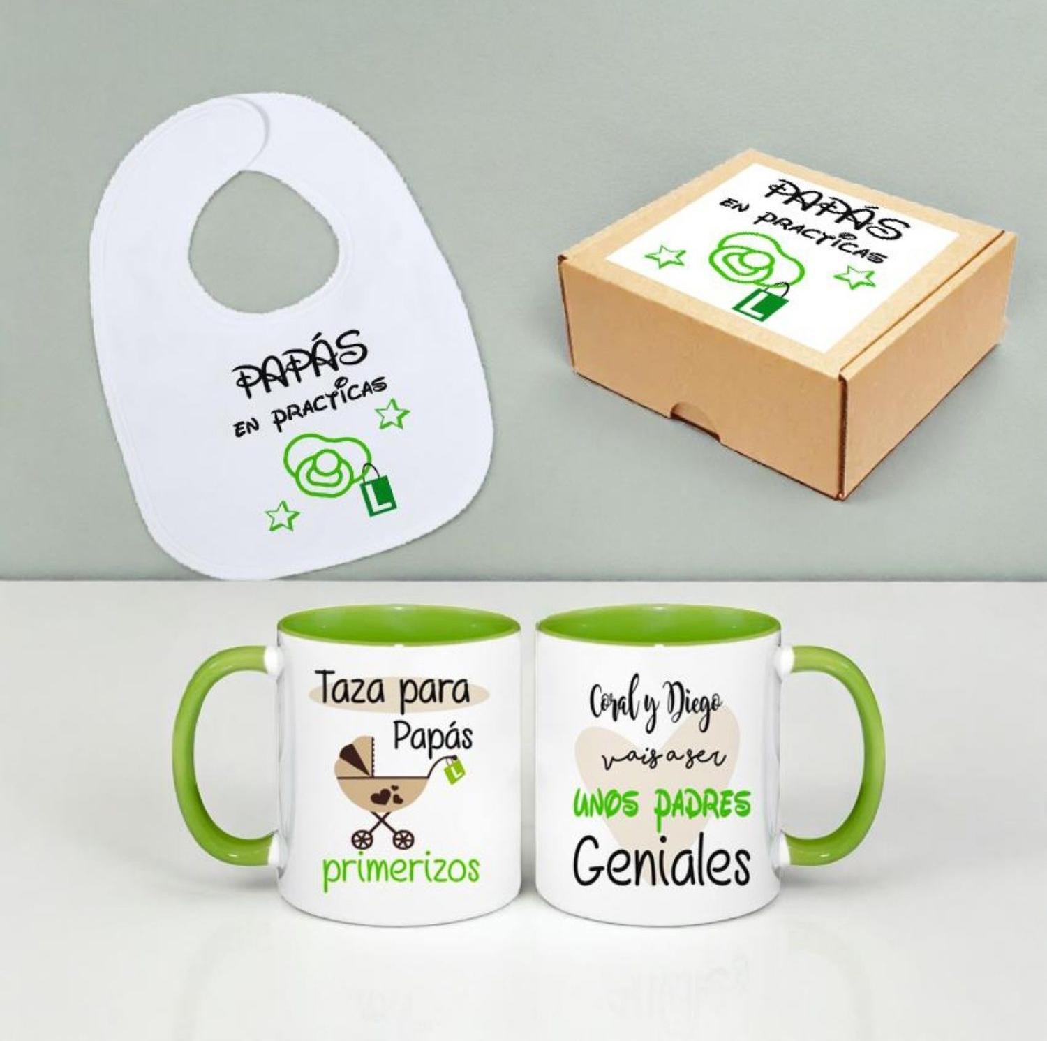 – Diseño: Babero con un divertido diseño que incluye el nombre del bebé y un texto “Papas en practicas”
