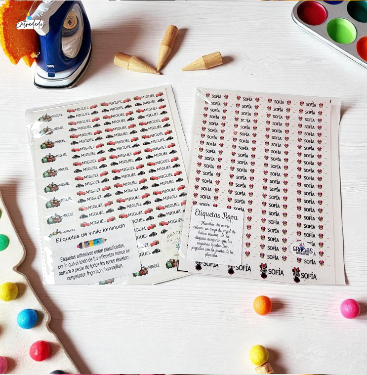 Las etiquetas personalizadas para planchar son una excelente forma de darle un toque único a la ropa escolar de los más pequeños. No solo ayudan a identificar la ropa, sino que también permiten que los niños se sientan más entusiasmados por usar su uniforme o su ropa diaria. A continuación, te presentamos algunas ideas y consejos para crear etiquetas personalizadas con sus personajes favoritos.  Etiquetas de tejido textil y se planchan en 30 segundos y resisten la lavadora. No aptas para secadoras medida aprox de la etiqueta es de 4 x 80mm