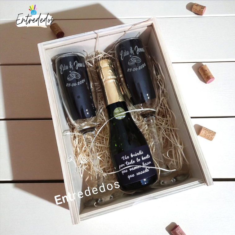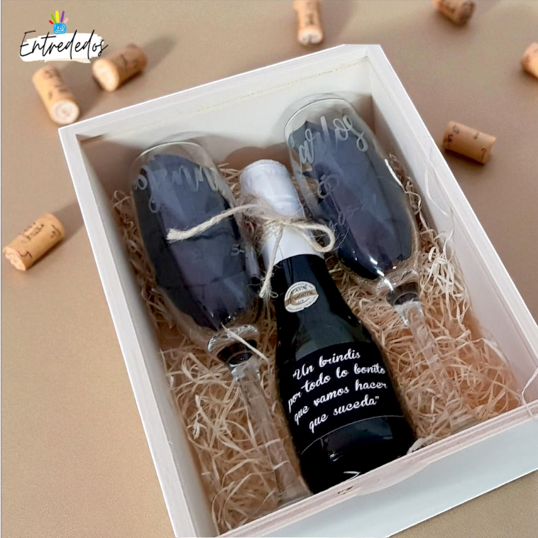 Para hacer este regalo aún más especial, ofrecemos la opción de enviar las copas en una caja personalizada. Esta caja no solo llevará grabado el texto que elijan, sino que también podrá usarse en el futuro para guardar otros recuerdos significativos de la pareja.
