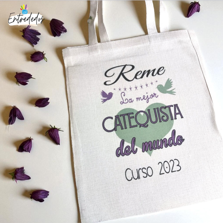 – **Mochila tipo lino o bolsa tote bag**: Perfecta para llevar libros, cuadernos y otros materiales necesarios para las clases. Personaliza la bolsa con el nombre de la catequista.