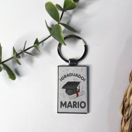 Elegante llavero metálico personalizado a 1 cara con forma rectangular .Se puede regalar como recuerdo de un evento especial; El exterior del llavero y su parte posterior son de metal muy resistente.
