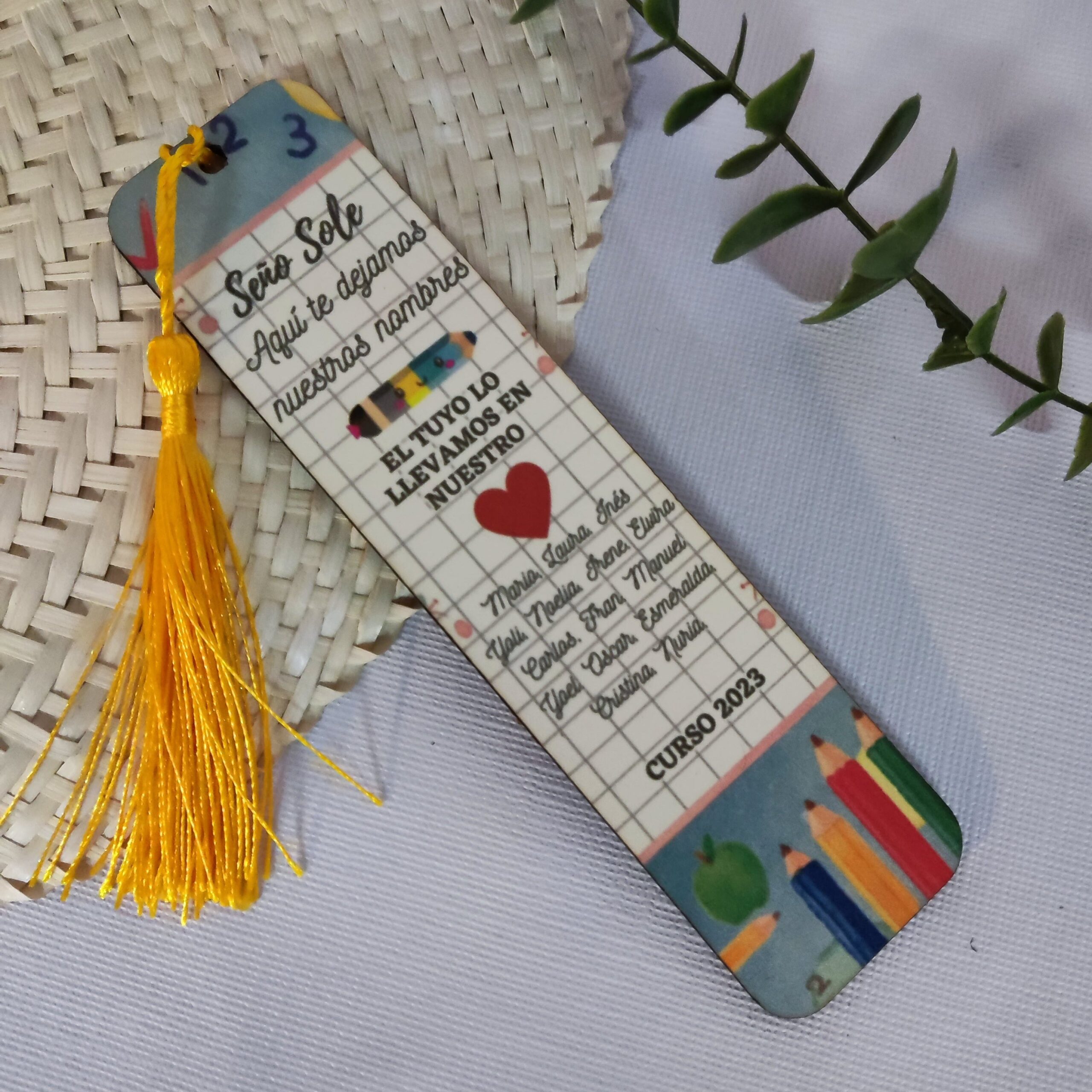 Marcapáginas personalizados para profesores, regalo de fin de curso. El marcapáginas es de madera de mdf y personalizado impreso a todo color.