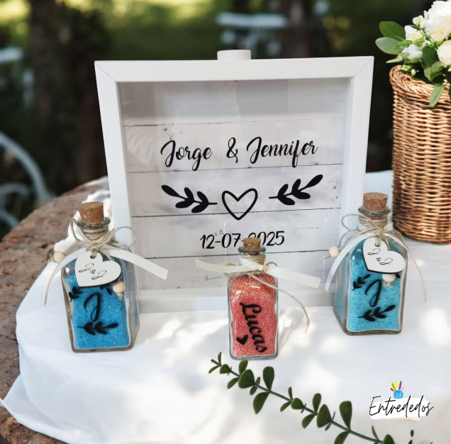 El ritual de arena es un momento mágico en el que dos personas mezclan diferentes colores de arena en un mismo marco, representando la unión de sus vidas 💕. Una tradición llena de significado que se convierte en un recuerdo físico y eterno de la unión espiritual de la pareja (y de los hijos, si se desea incluirlos).