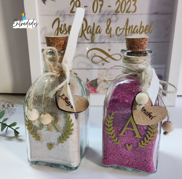 2 botes de arena personalizados con nombres y corazón grabado 💌