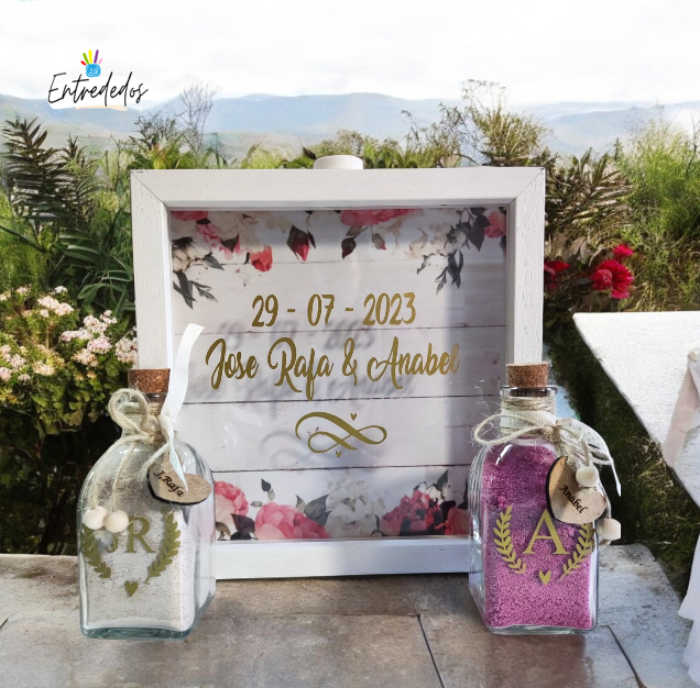 El ritual de arena es un momento mágico en el que dos personas mezclan diferentes colores de arena en un mismo marco, representando la unión de sus vidas 💕. Una tradición llena de significado que se convierte en un recuerdo físico y eterno de la unión espiritual de la pareja (y de los hijos, si se desea incluirlos).