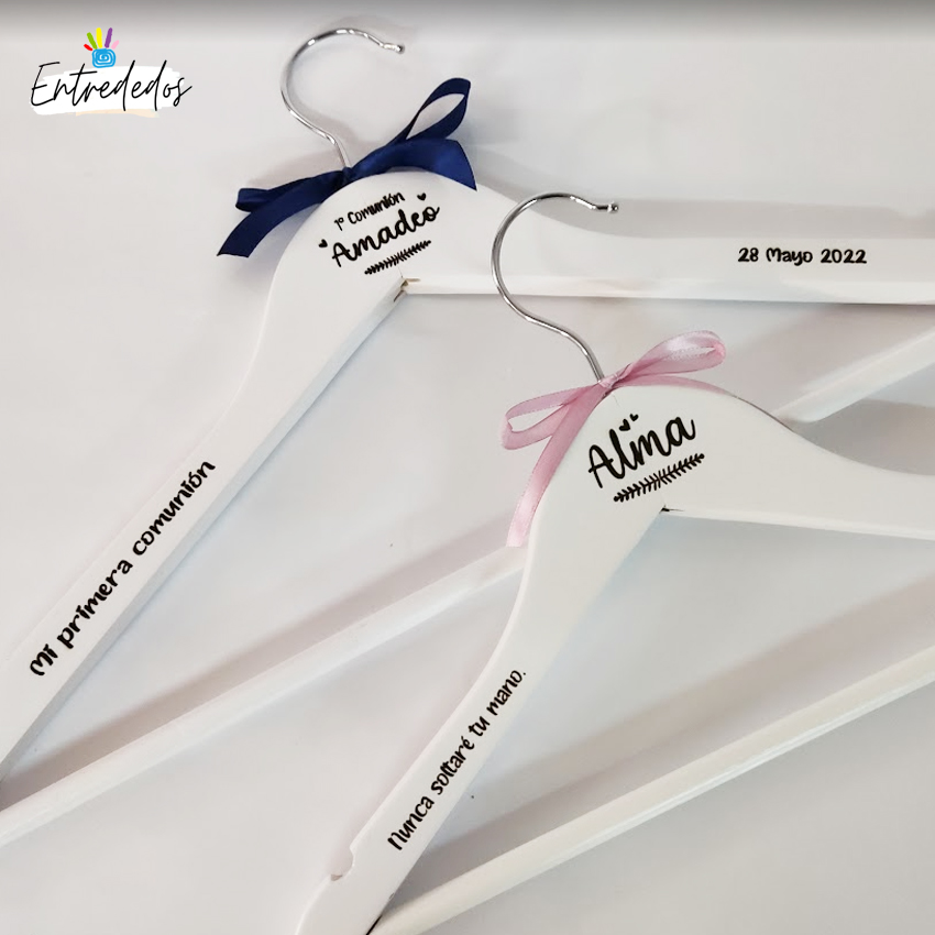 La primera comunión es un momento único en la vida de los niños y niñas ✨. Haz que su día sea aún más especial con nuestras perchas blancas personalizadas, grabadas con el nombre del niño o niña, la fecha de la ceremonia y un dibujo de ramas o frase significativa 🌿. Perfectas para complementar el atuendo y convertirse en un recuerdo eterno.