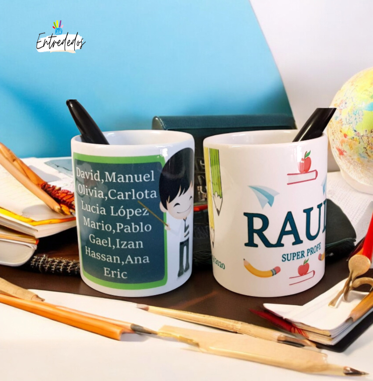 • 🏺 Portalápices de cerámica: personalizado con el nombre del profesor y de todos los alumnos.