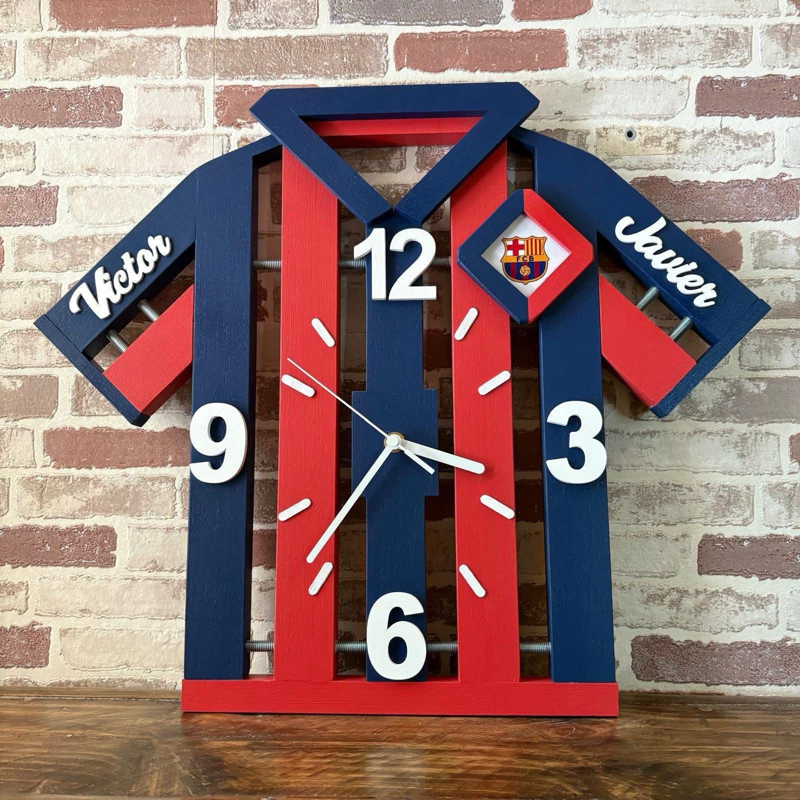 Un bonito reloj, inspirado en la camiseta de tu equipo, hecho a mano en madera maciza, tamaño 42×28, único y con un diseño espectacular, preparado para colgarlo y disfrutarlo, y con un sistema silencioso!!!