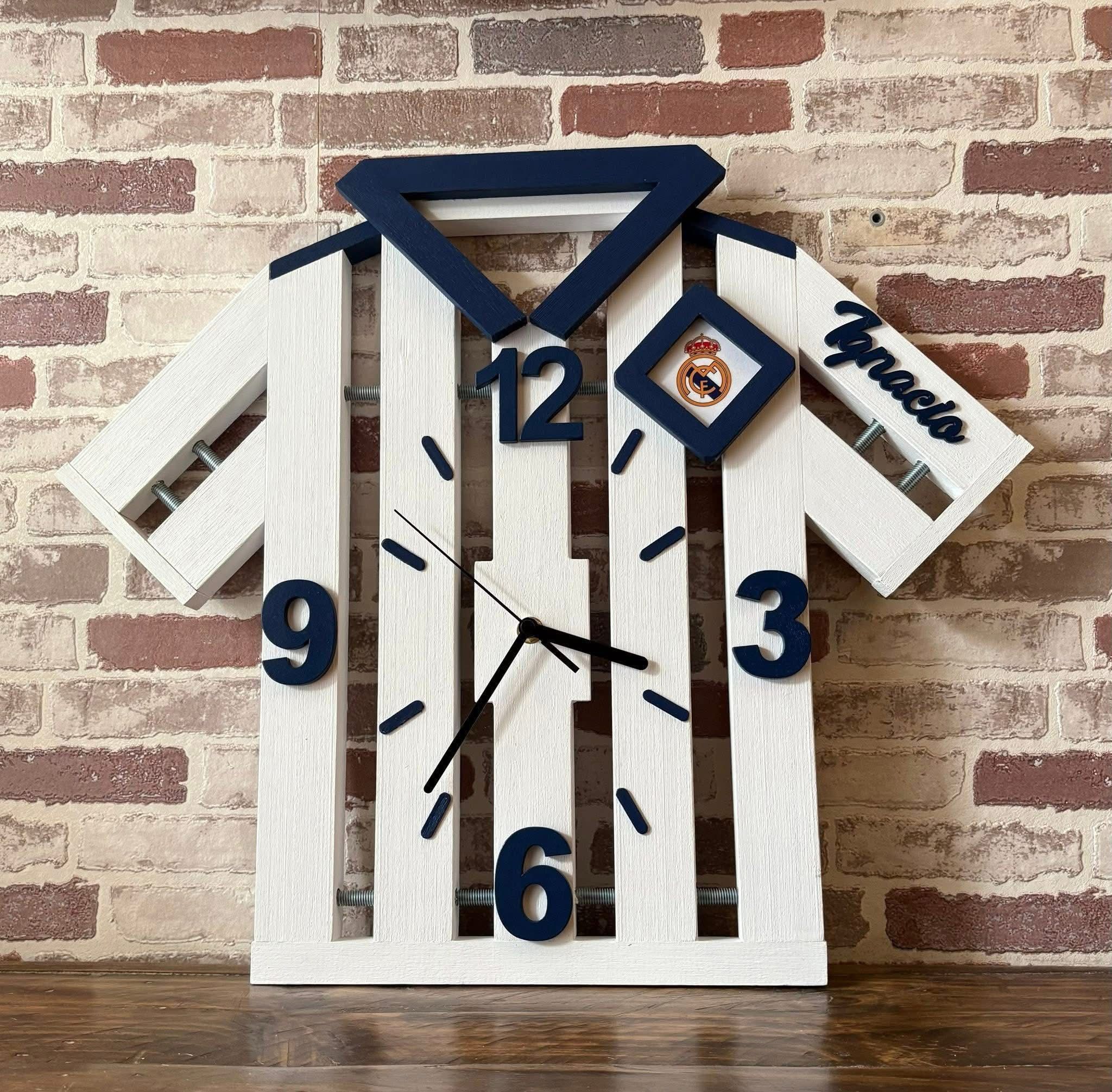 Un bonito reloj, inspirado en la camiseta de tu equipo, hecho a mano en madera maciza, tamaño 42×28, único y con un diseño espectacular, preparado para colgarlo y disfrutarlo, y con un sistema silencioso!!!