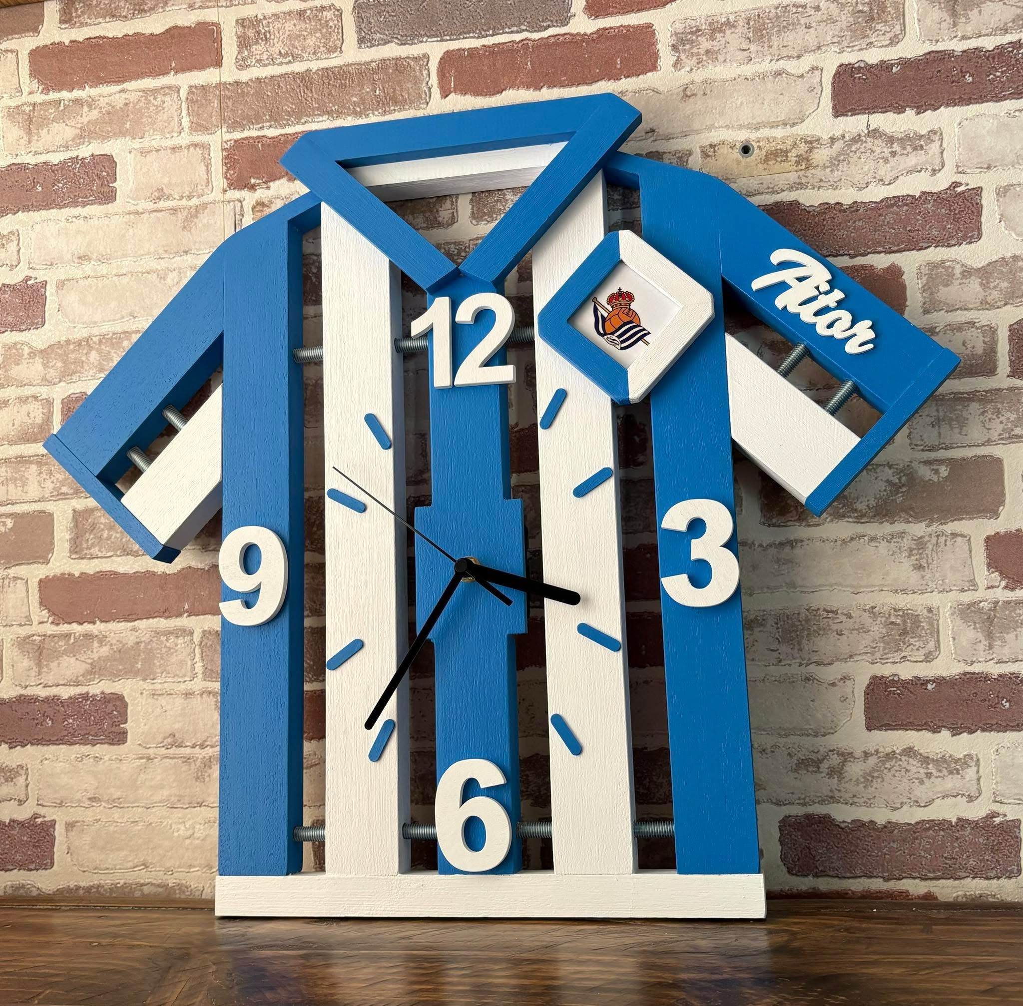 Un bonito reloj, inspirado en la camiseta de tu equipo, hecho a mano en madera maciza, tamaño 42×28, único y con un diseño espectacular, preparado para colgarlo y disfrutarlo, y con un sistema silencioso!!!