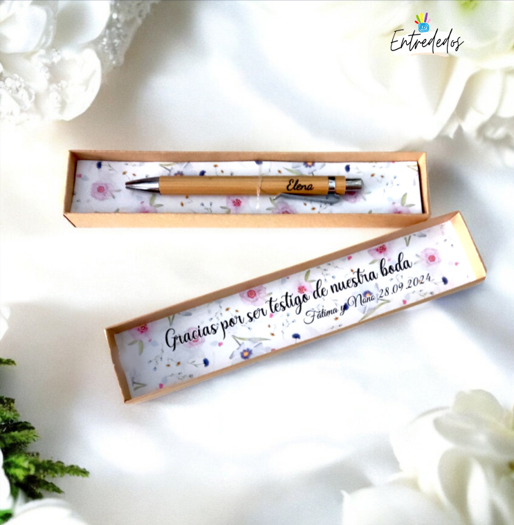 🖊 Cajita de cartón con bolígrafo de bambú grabado con el nombre o frase que elijas.