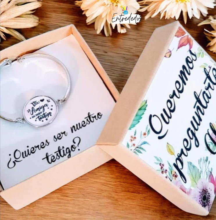 ✨ Pulsera de acero inoxidable personalizada con la frase “Mi amiga, mi mejor testigo” (opción de cambiar por hermana, cuñada, hijo, etc.).