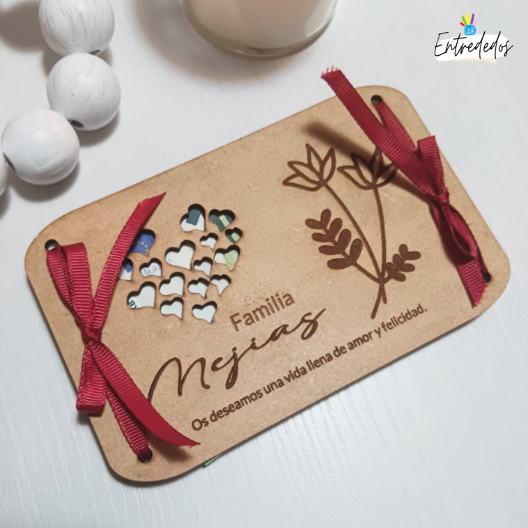 Incluye el nombre o apellido de la familia y añade tu propio mensaje de tu puño y letra o dedicatoria en la parte trasera con un rotulador permanente. ¡Un regalo con estilo y corazón! 💝